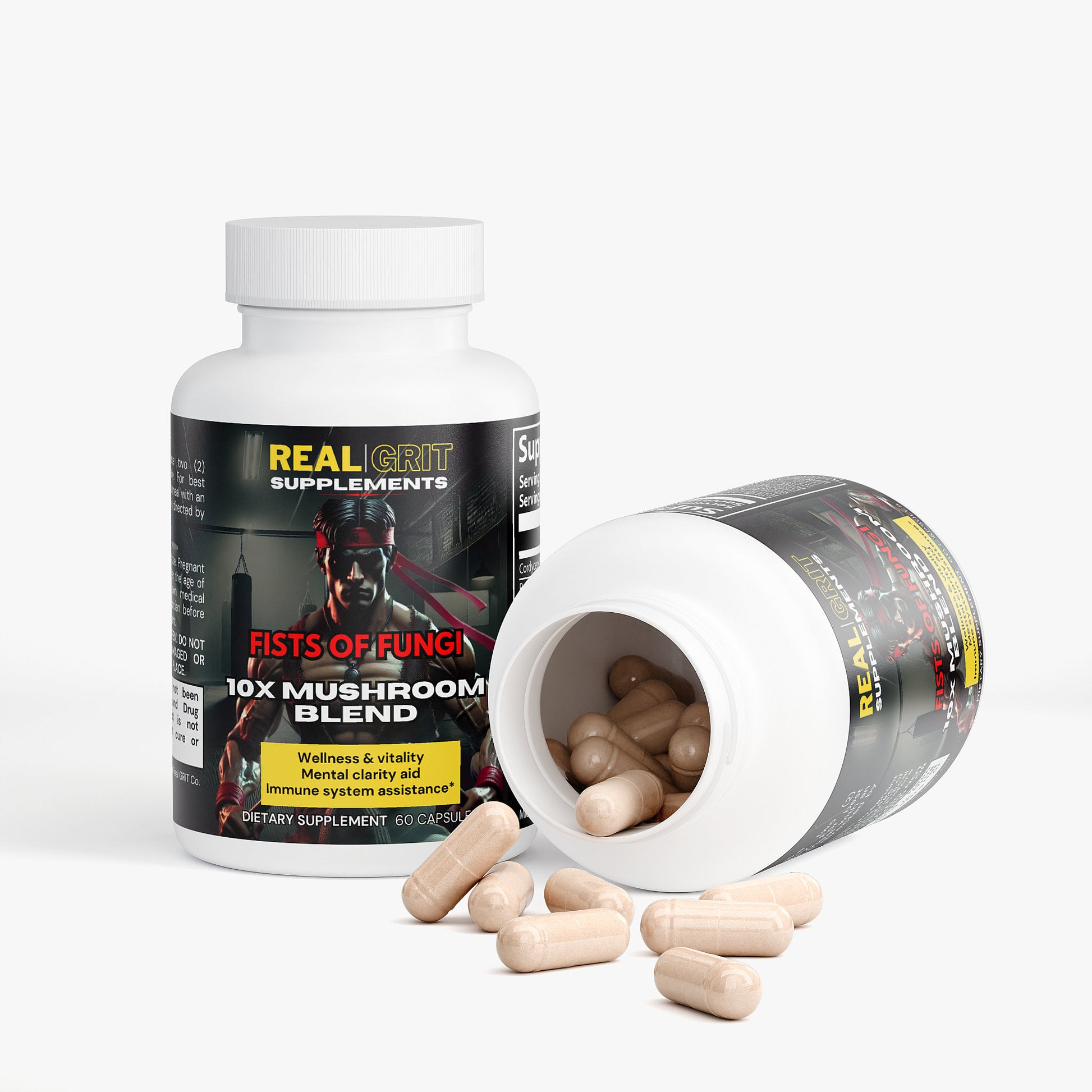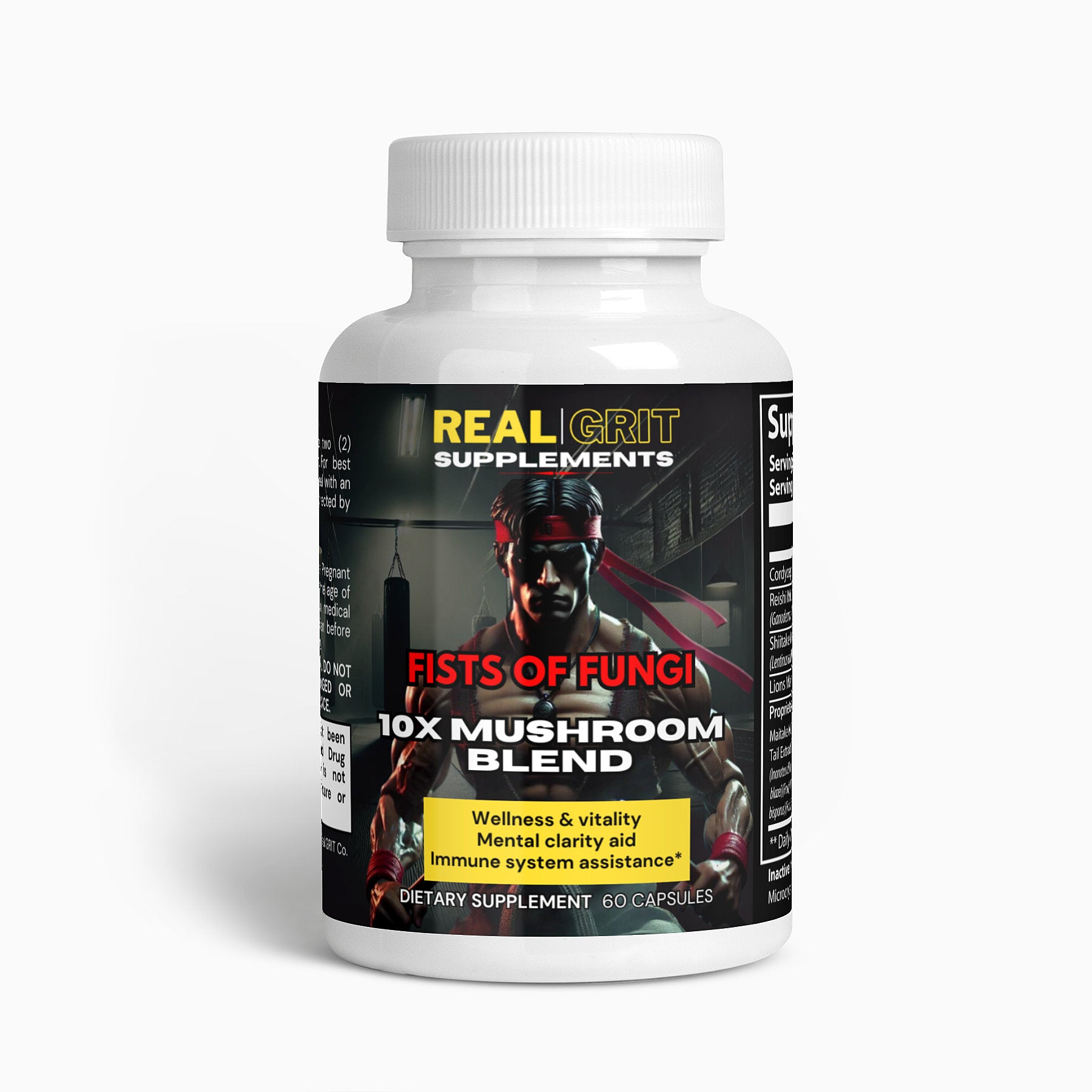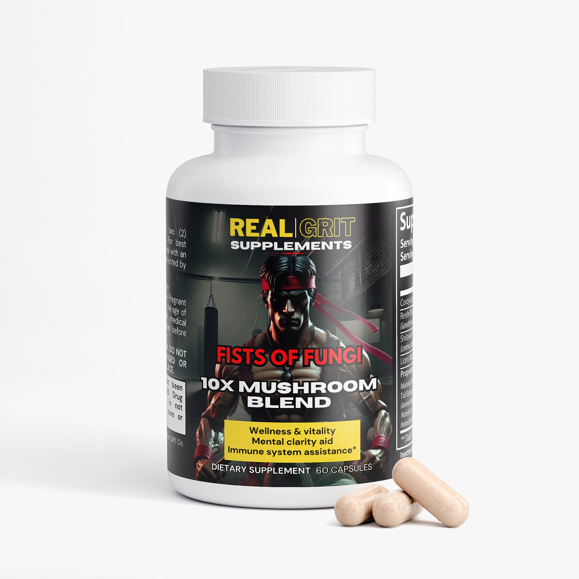 Elevate your strength, focus, and vitality with Fists of Fungi, the ultimate mushroom blend engineered for the modern warrior. Inspired by the relentless spirit of martial arts legends, this powerful supplement harnesses the strength of ten potent mushrooms, including Lion's Mane, Reishi, and Cordyceps, to fuel your body and mind. Each capsule is designed to enhance your physical prowess and mental clarity, giving you the edge to conquer any challenge. Embrace the power within and strike with the precision and intensity of a true fighter. Fists of Fungi—your secret weapon for peak performance.