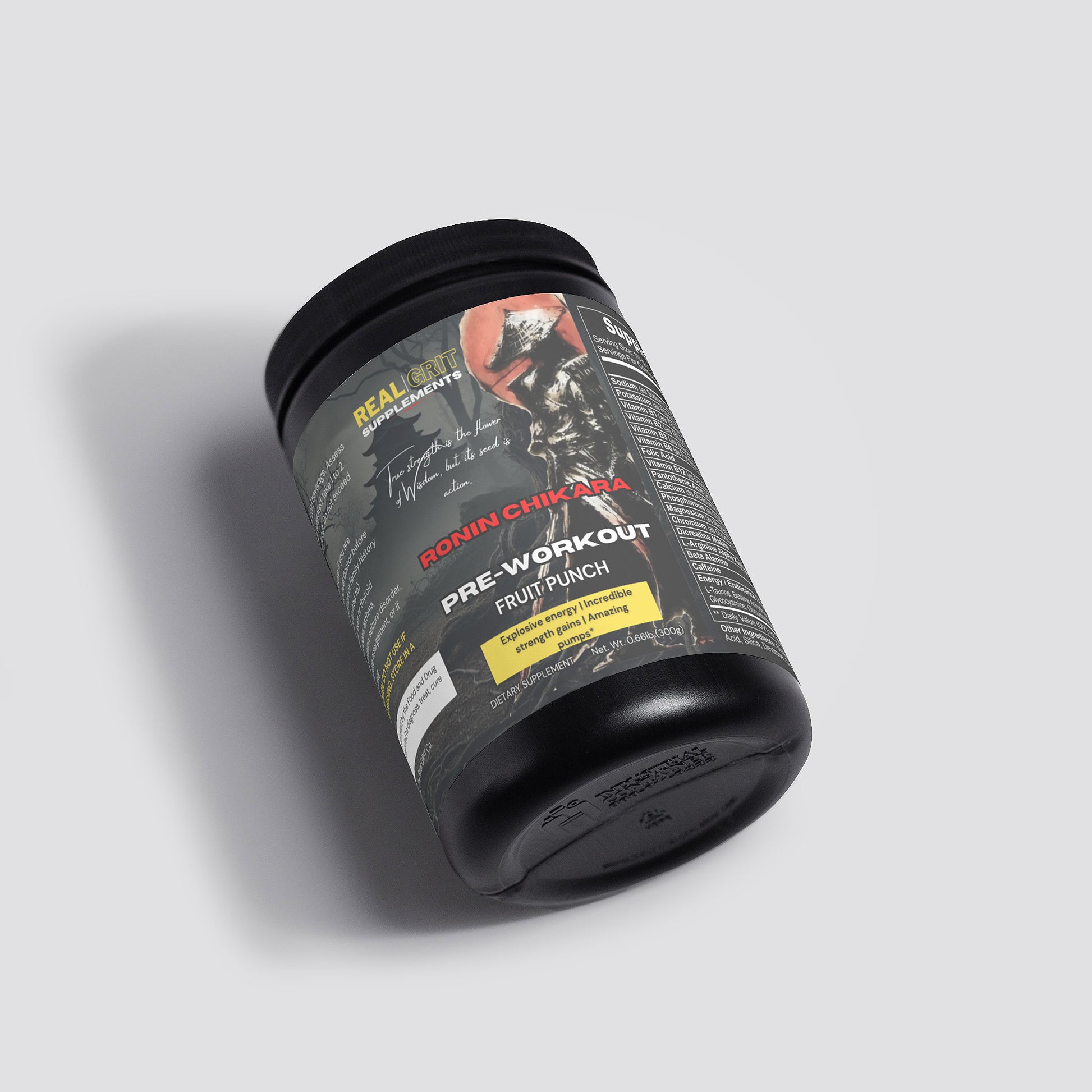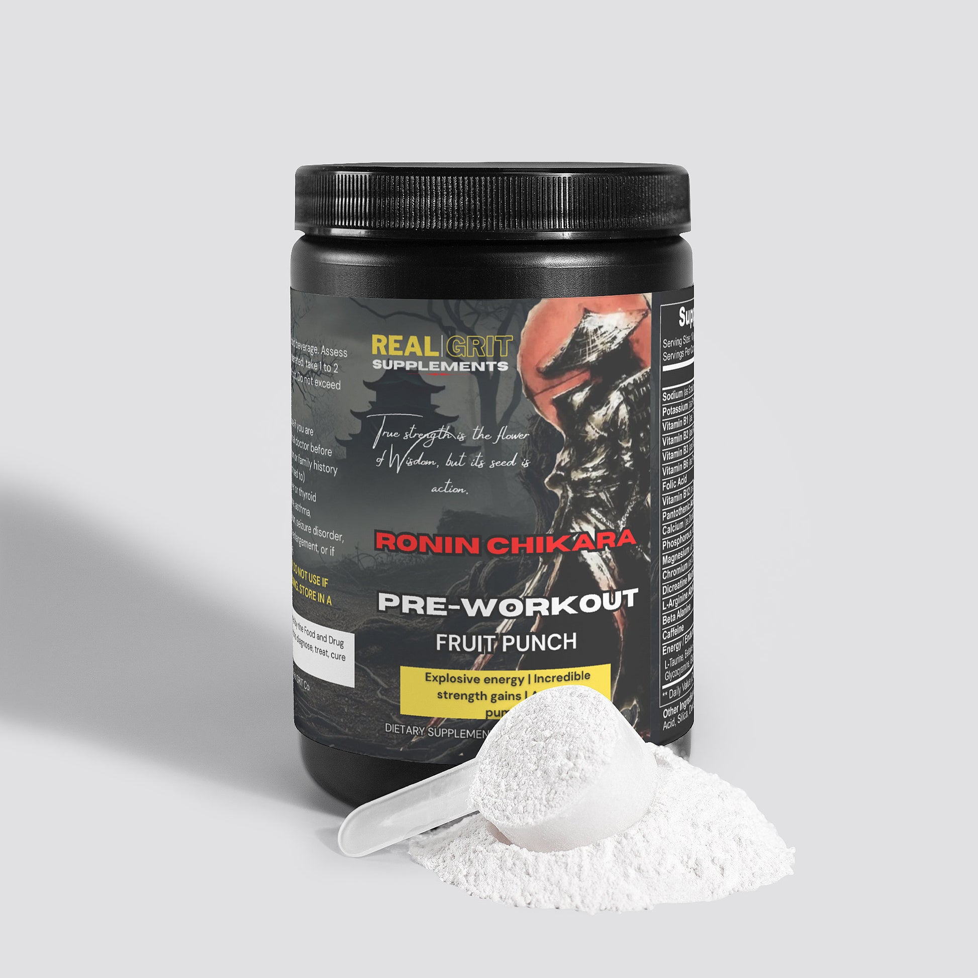 Harnessing the essence of Chikara—Japanese for power—this supplement is meticulously formulated to fuel your body with explosive energy, sharpen your focus, and enhance your strength. Every serving is designed to push your limits, ensuring you train with the relentless determination of a true warrior. Whether you're conquering the gym or facing life's daily battles, Ronin Chikara empowers you to rise above, unleashing the inner strength of a samurai with every rep and every step.
